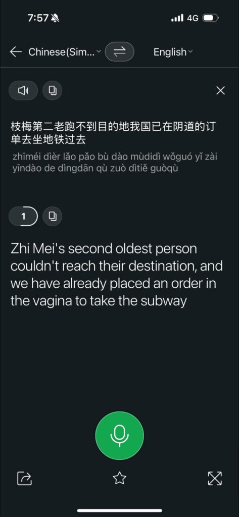 Finally it was time to find a Didi (uber) and make the 1.5 hour trip into the city to my hotel. I booked the trip. The app makes you pay in advance. I did that. I was standing on a street corner in the dark. My driver turned up, got out of his car and started yelling at me in Chinese. I had no clue what he was saying. I got out the translation app and tried to work it out. Some of the other supporters heard the commotion and came over. Anna used a translation app with voice recording. We both looked at the translation of what old mate just said.