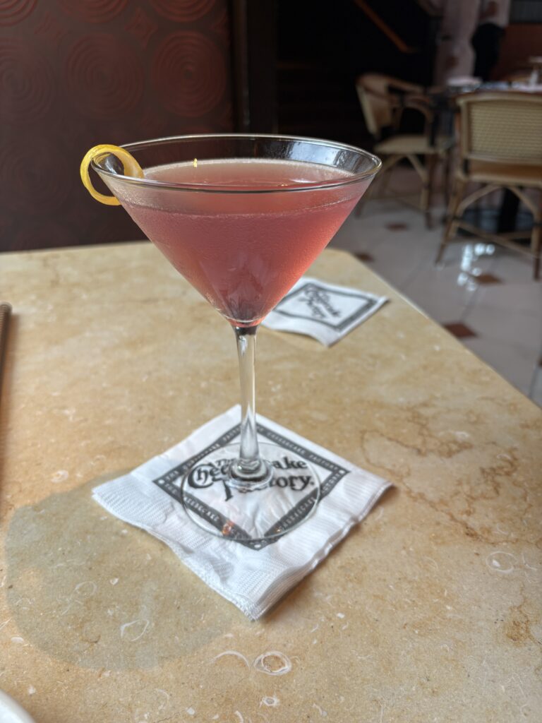 The Cheesecake Factory. I have never, ever enjoyed a Cosmopolitan so much in all my life. Maybe three.